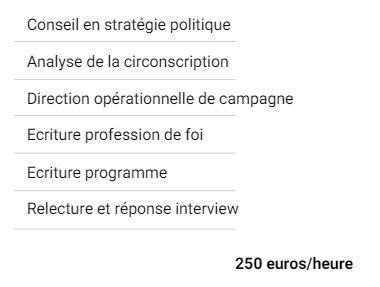 Nos tarifs sont des tarifs horaires exprimés en euros. Ces tarifs peuvent être proratisés en fonction du nombre de candidats appartenant à un même parti politique ou groupement de partis politiques. En ce cas, un template programmatique et rédactionnel est créé au prorata des candidats concernés. La direction opérationnelle comprend aussi l’étude de marchés et l’appel d’offres afin de vous négocier la meilleure délivrabilité. La rédaction de vos recours auprès de la commission de la propagande durant la campagne entrent aussi dans cette catégorie.
